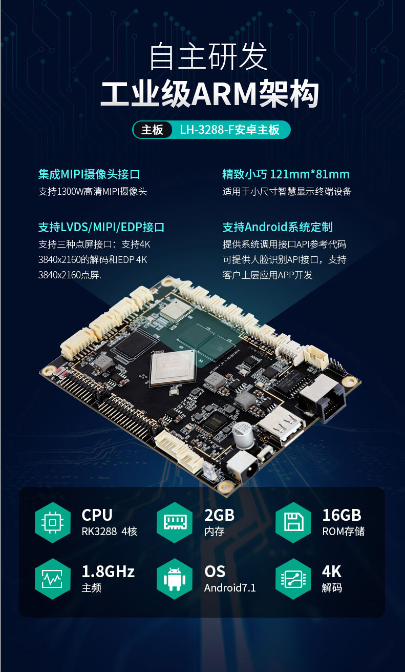 ·標準配置采用自主研發主板RK3288,運行內存和硬盤儲存分別為2G+ 16G,性能更穩定,支持配置升級,滿足出入常見長時間運行工作狀態;