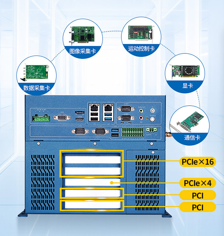 四卡槽版搭載1*PCIe X16、1*PCIe X4、2*32bit PCI共四個擴展插槽,支持高速GPU、圖像采集卡、運動控制卡、AI加速等功能配置,可增強特定工業(yè)應(yīng)用的硬件拓展和功能定制彈性。